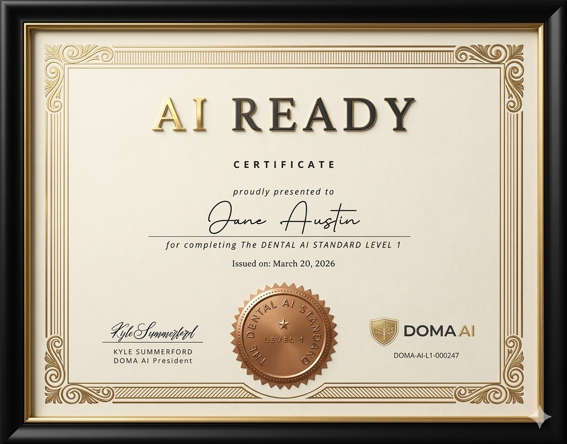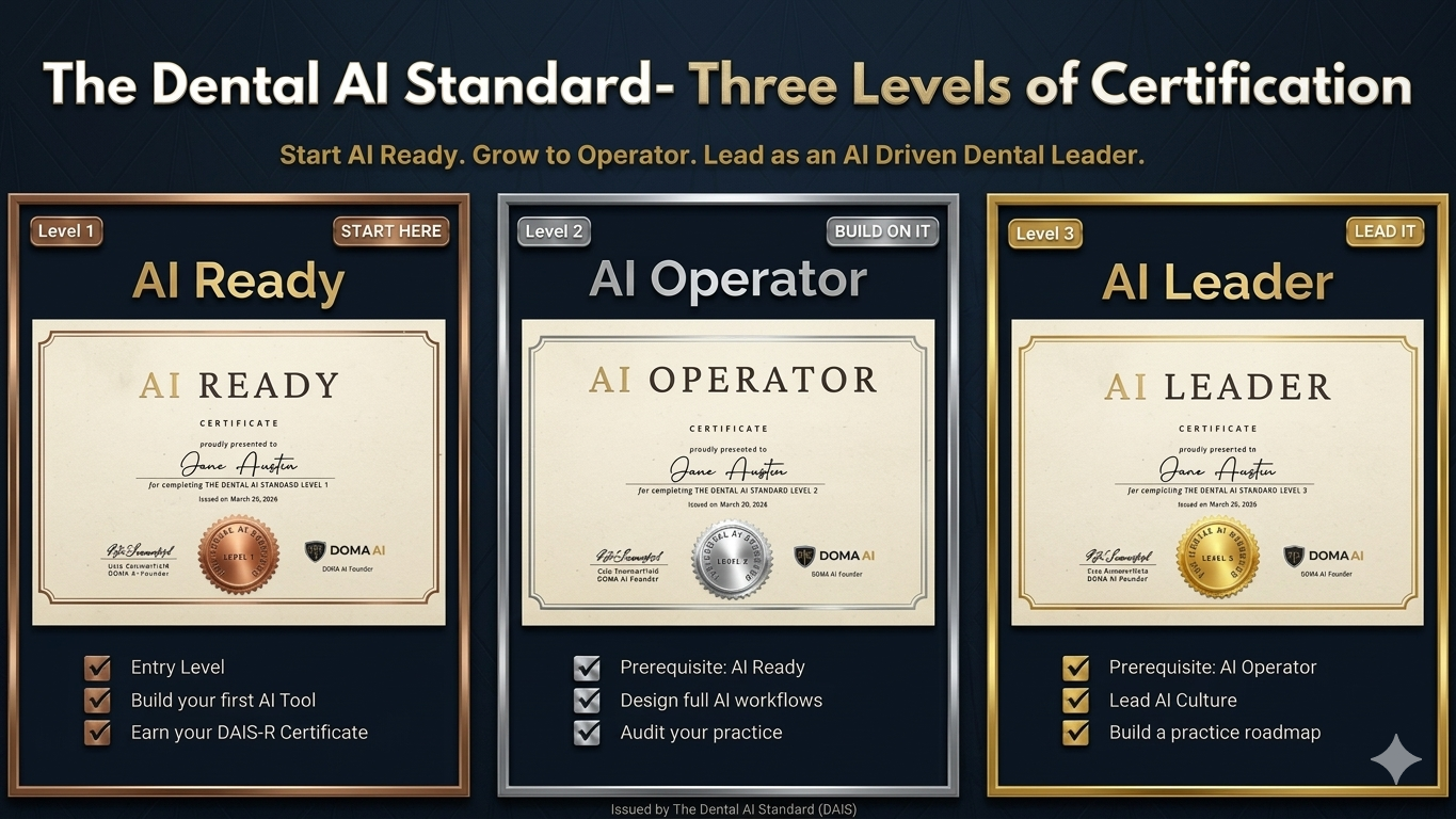 AI Ready is Level 1 of The Dental AI Standard certification pathway. It is where every certified dental AI professional starts. Complete AI Ready and you earn your DAIS-R badge. You also unlock the path to AI Operator — where you design full practice AI workflows — and eventually AI Driven Dental Leader — where you lead AI adoption across your entire organization. Most dental office managers stop at whatever knowledge they can piece together on their own. The Dental AI Standard gives you a structured path from where you are right now to where your practice needs you to be. You do not have to know where you are going when you start. You just have to start.