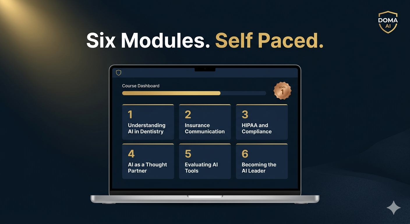 Work through six modules at your own pace and complete the AI Ready certification in as little as one week. Insurance, patient communication, compliance, vendor evaluation, and AI leadership. All built specifically for dental teams.