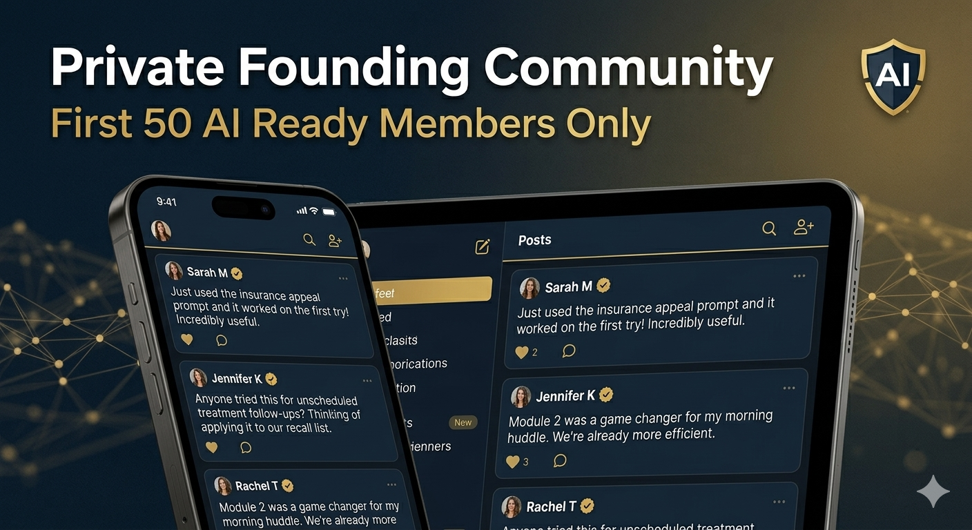 Exclusive private community for the first 50  AI Ready certified dental professionals. Share prompts. Post wins. Ask questions. In from day one.